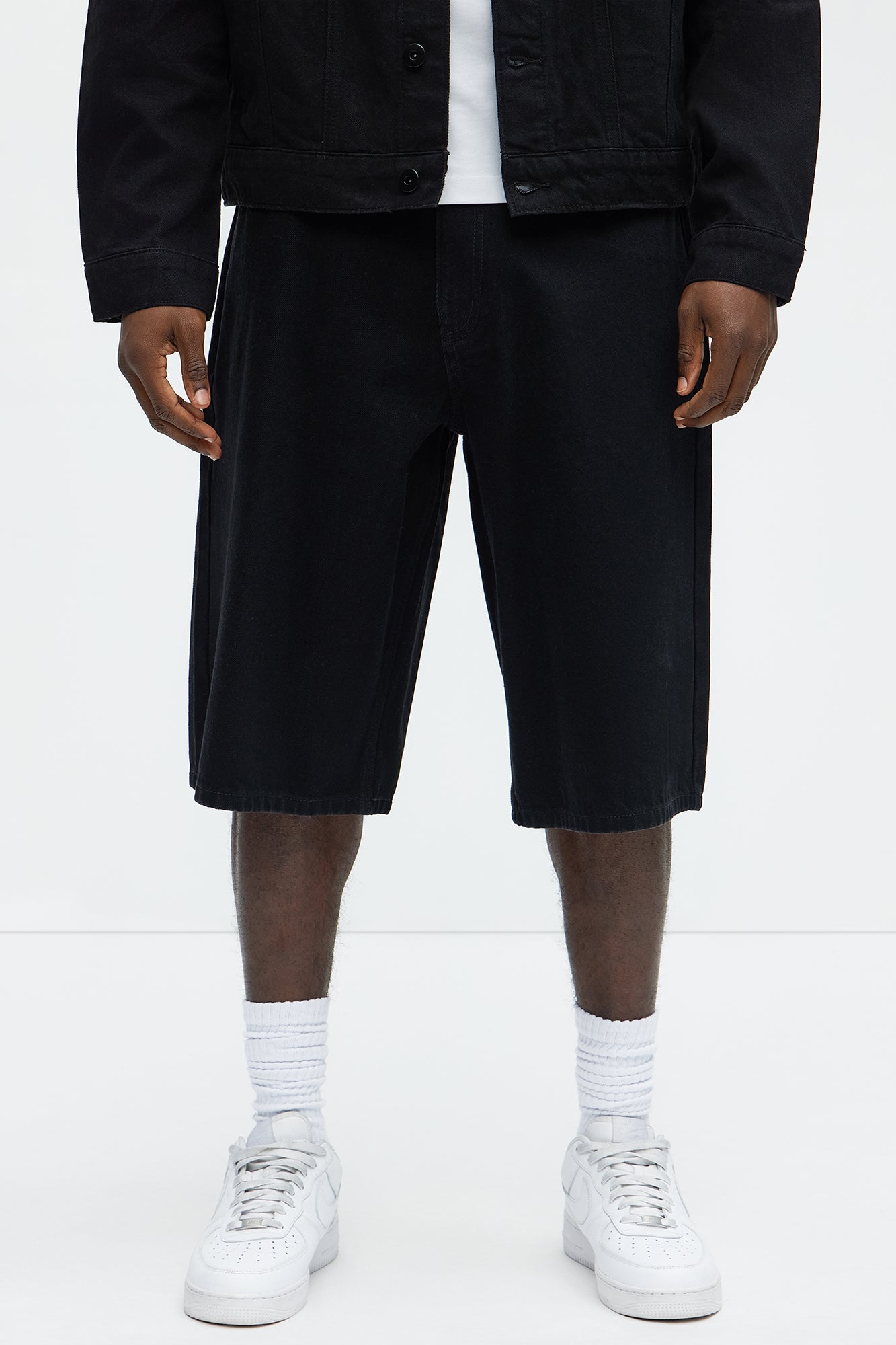 The Colin Baggy Denim Shorts in black offer a relaxed, oversized fit perfect for casual everyday wear. Crafted from premium stretch denim, these shorts provide comfort and durability for all-day movement. Key features include a loose baggy silhouette, mid-thigh length, zip fly with button closure, and classic five-pocket design. Ideal for summer outings, beach days, or lounging, they pair effortlessly with tees, tanks, or button-ups. Available in regular sizing for an authentic streetwear vibe. Machine washable for easy care. Elevate your wardrobe with these versatile black denim shorts.