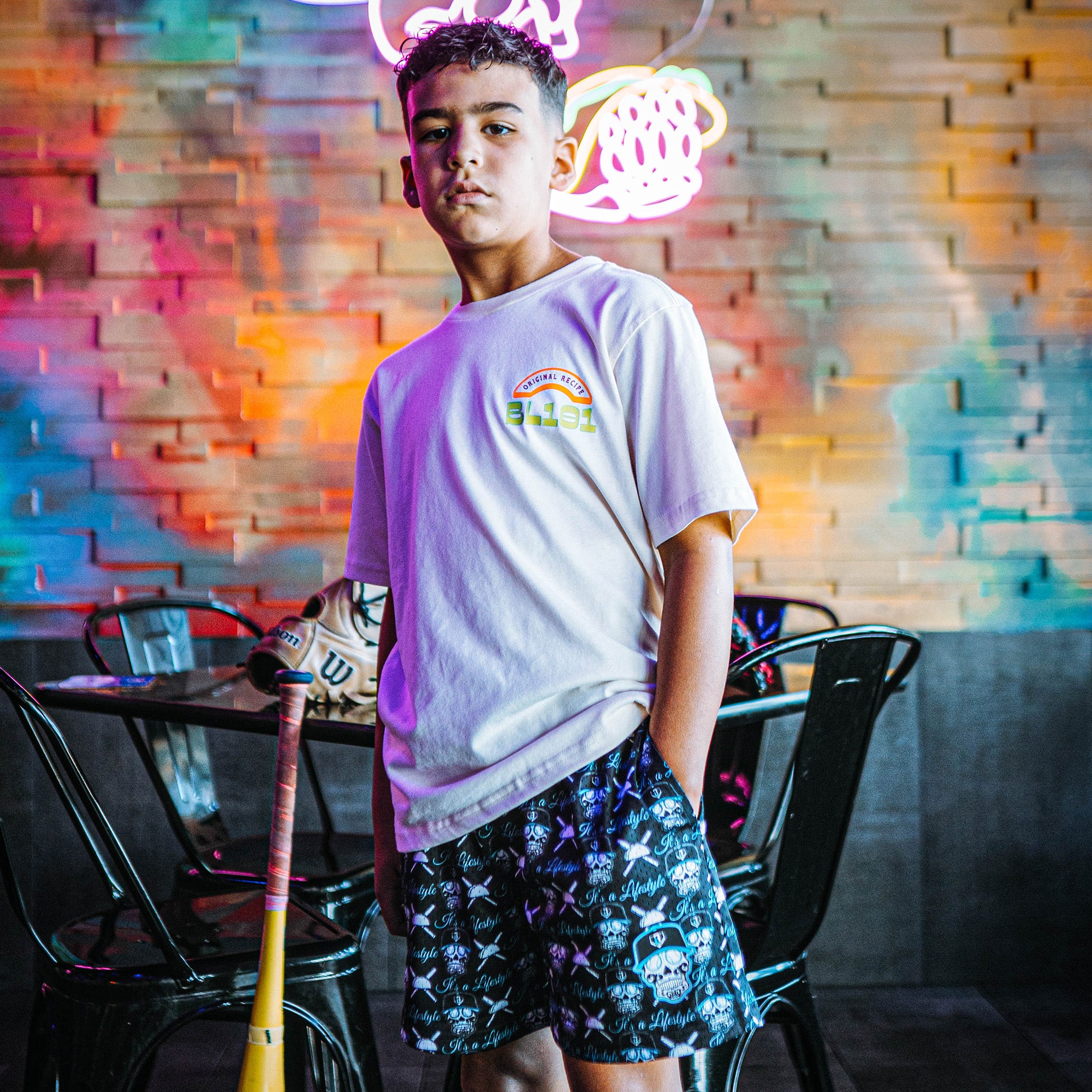 The Slugger Skull Shorts bring serious heat with an all-over skull and crossbats pattern that’s absolutely killer. These black shorts with a blue waistband are perfect for young ballers who crush tacos as hard as they crush baseballs. Whether you’re stepping into the batter’s box or just repping that skull-crushing baseball lifestyle, these shorts deliver serious comfort and edge. Mesh Shorts 100% Polyester Side Pockets Drawstrings at the inner waistband Elastic Trim
